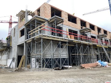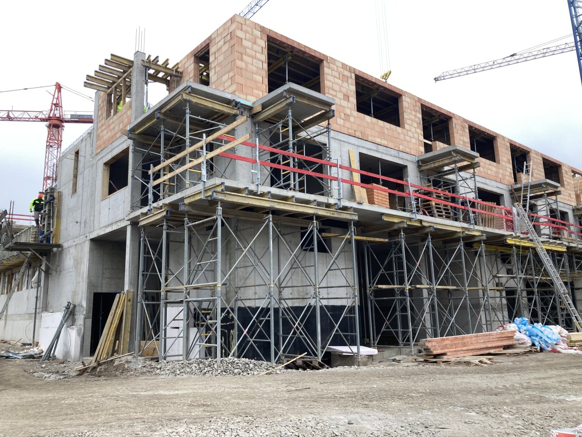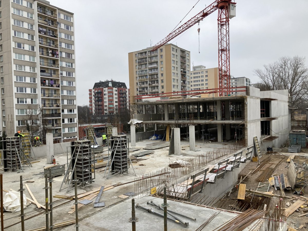 V objektu C jsou hotovy monolitické konstrukce v 1 NP a začínají se provádět svislé nosné konstrukce. V objektu D je vyzděno 2 NP a připravují se práce na stropní konstrukci. V objektu F se pracuje na monolitických nosných částech parkovacího dom.